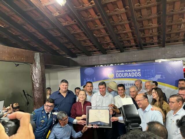 O governador Eduardo Riedel (PSDB) recebeu, durante o início da noite desta sexta-feira (9), diploma de honra ao mérito da Câmara Municipal de Dourados, em sessão solene que abriu a 59ª edição da Expoagro, no município situado a 251 quilômetros de Campo Grande. A homenagem, que também reconheceu o ex-governador Reinaldo Azambuja, foi marcada por um discurso sobre o compromisso com o agronegócio e com o desenvolvimento do estado.