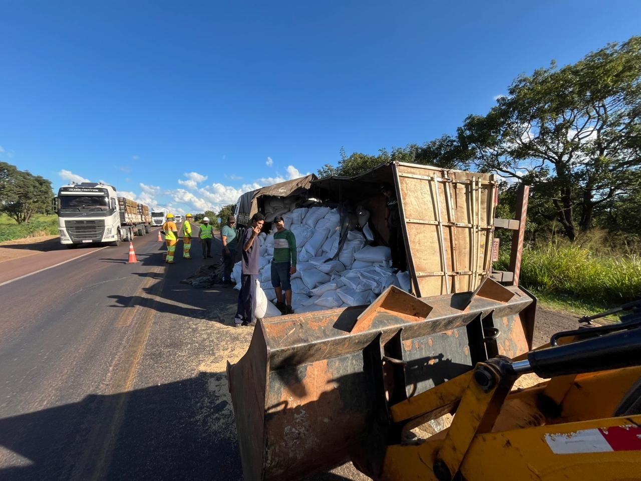 A carga de gergelim ficou espalhada parcialmente pela rodovia e o caminhoneiro foi preso por embriaguez ao volante