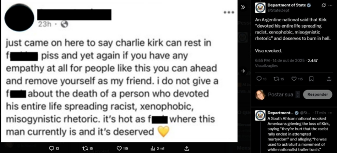 O governo Donald Trump afirmou que revogou vistos americanos de estrangeiros que comemoraram a morte de Charlie Kirk nas redes sociais e postou exemplos.