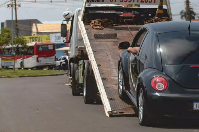 Carro sendo guinchado por empresa de seguro em Campo Grande (Foto: Marcos Maluf)