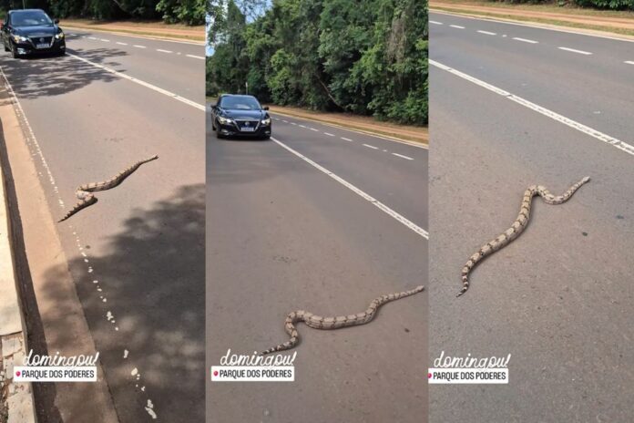 O que parecia ser uma simples tarde de pedalada em família para o corretor Deivison Medeiros e a esposa, se transformou em um passeio inusitado. O casal andava de bicicleta no Parque dos Poderes, em Campo Grande, por volta das 14h deste domingo (21), quando viu uma jiboia saindo da área de mata e seguindo em direção à rua. Veja o vídeo acima.